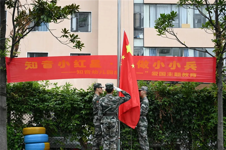 虽然知音幼儿园每周都会举行升旗仪式,但是为了能让小朋友们感受更加庄严的升旗仪式,本次国防教育特邀军人叔叔们前来示范。现场庄严肃静,小朋友们对缓缓升起的国旗行注目礼,表达崇高的敬意。