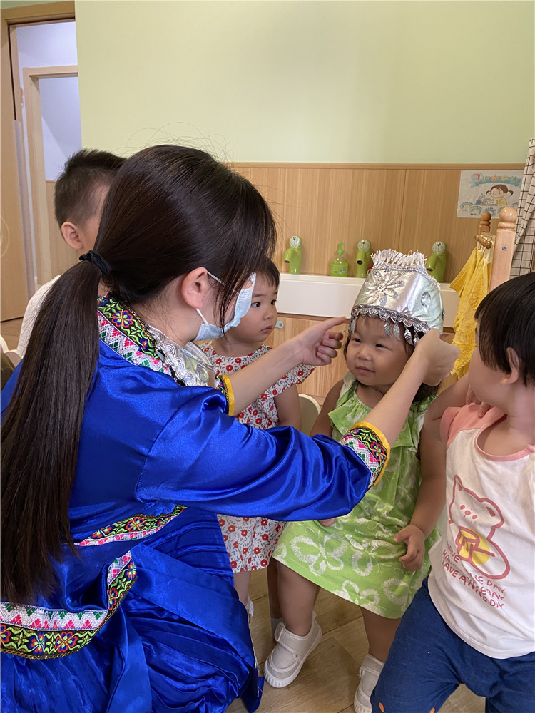 中国是由五十六个民族组成的大家庭。妇幼知音托育中心的老师身穿少数民族服装,向小朋友们介绍少数民族的民族文化。摸一摸、看一看、听一听,感受少数民族的文化与风情。