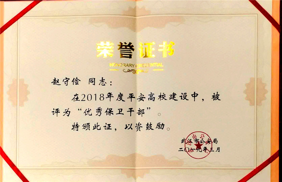 近日,武汉市公安局召开平安高校建设工作总结表彰会,会上,武汉信息传播职业技术学院被授予2018年度平安高校建设“优秀单位”荣誉称号,保卫处处长赵守俭被评为“优秀保卫干部”,这是继学院在获得江夏区2018年度社会治安综合治理“优胜单位”后,荣获的市级荣誉。