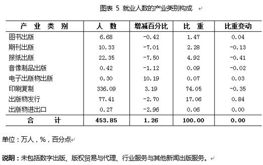 就业总人数增长,报纸、期刊从业人数降幅大。2016年,全国新闻出版业直接就业人数为453.9万人(不包含数字出版、版权贸易与服务、行业服务与其他新闻出版业务单位就业人员),较2015年增长1.3%。印刷复制业直接就业人数336.1万人,提高3.2%;出版物发行业77.4万人,降低2.7%;报纸出版业22.4万人,降低7.5%;期刊出版业10.3万人,降低7.0%;图书出版业6.7万人,降低0.4%。